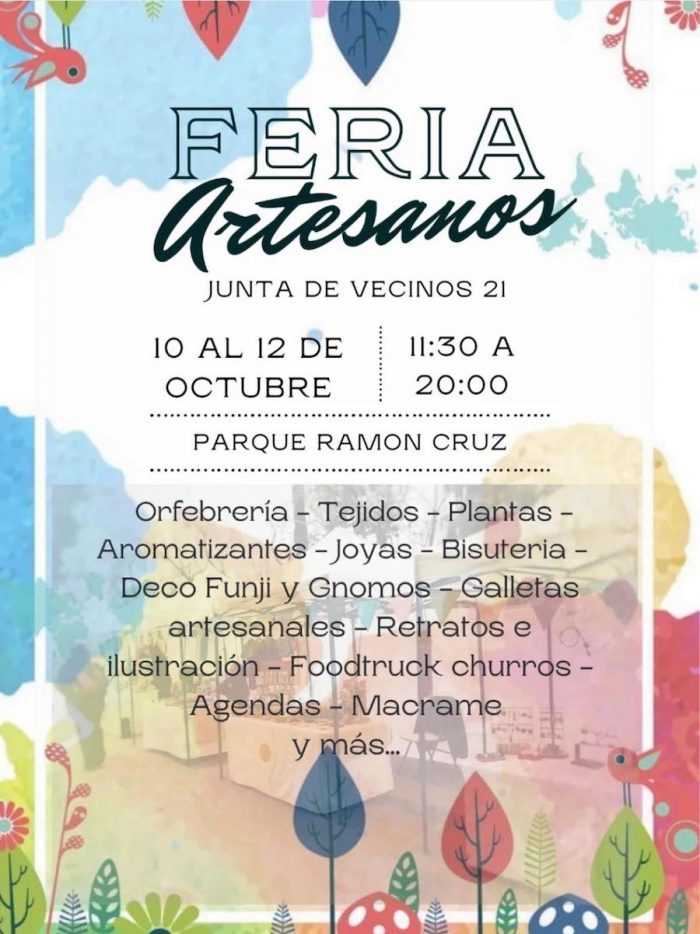 📅Del 10 al 12 de octubre, el Parque Ramón Cruz se transforma en un rincón mágico lleno de colores, aromas y creaciones únicas. Desde las 11:30 hasta las 20:00 hrs, ven a recorrer los stands de orfebrería, tejidos, plantas, aromatizantes, joyas, deco funji y gnomos, ilustraciones, galletas artesanales y mucho más. ¡Y sí, también habrá churros! 😋